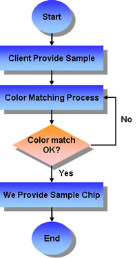 Firstly, you as our clients start the process by providing us a sample of your desired color in several form, e.g. Final product, Paper, Paint, Pantone color number, SIK color chips etc.